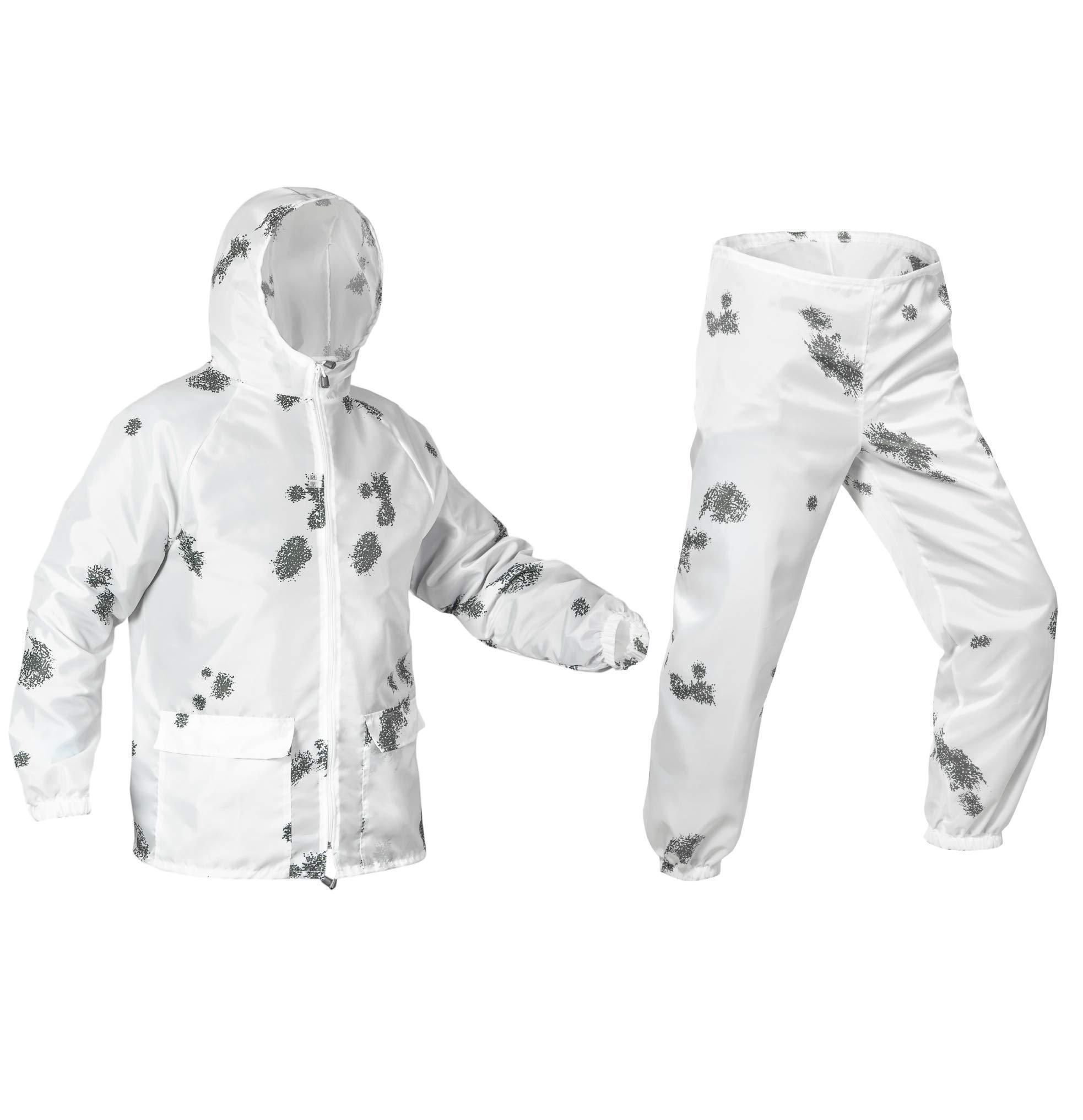 2.masking overall - our brand new camo winter hunting camouflage consists of hooded jacket and pants. intended to be worn over your winter clothes to make you vanish in snowy surroundings. the jacket has a large draw-stringed hood, designed to go over the helmet, elastic cuffs on the sleeves, a zipper in the front and draw-stringed bottom. the pants have draw-stringed waist and elastic cuffs on the bottom.