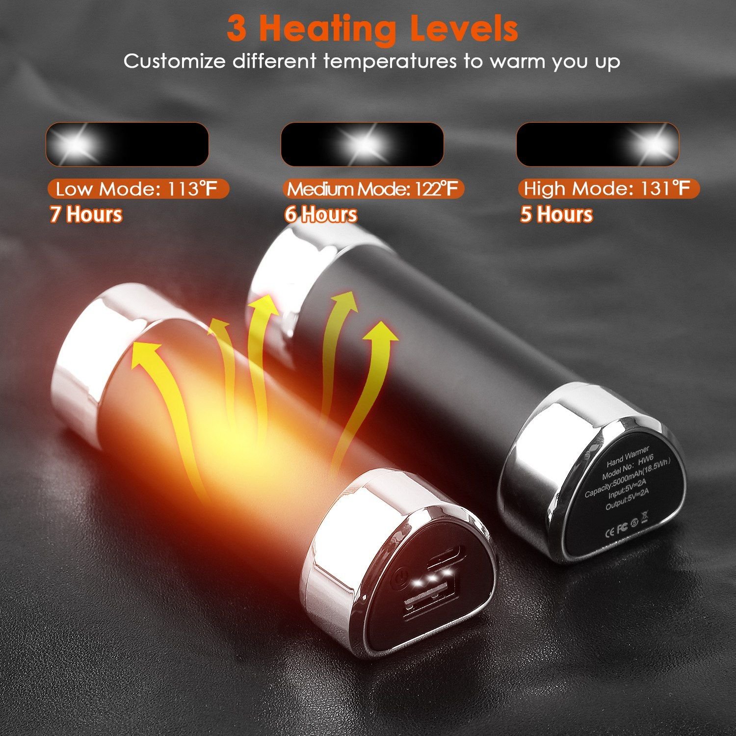 *10000mah Rechargeable Power Bank*:Built-in 5000mA battery for per hand warmer(2 Packs Total 10000mAh) offers 5-10hrs warmth for you. Besides,it also can be used as an emergency backup battery phone charger. Note:When heating function is on,the hand warmer cannot charge other devices.