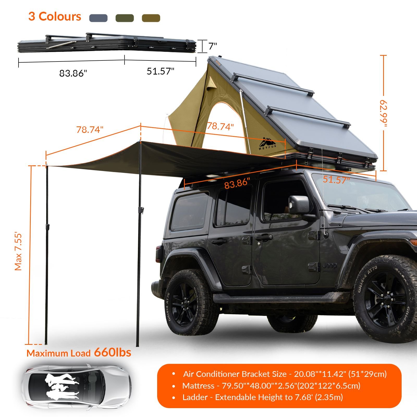2.  [Upgraded Roof Top Tent to 100% Market Excellence] - HEYFUN rooftop tents are standout options with premium features including extra attachable side awning, air conditioner outlet with detachable bracket, adjustable luggage racks and replaceable rain curtains, best travel solution for carrying more luggage and perfect choice for camping enthusiasts and seasoned adventurers of all levels valuing quality and affordability.