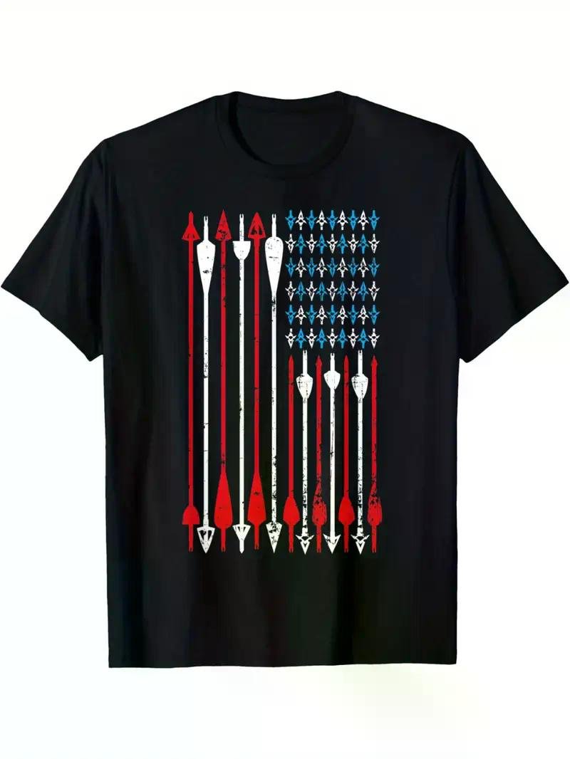 Vintage American Flag Archery Bow Hunting T-Shirt, 100% Cotton Crew Neck Short Sleeve Tee, Geometric Pattern Knit Fabric